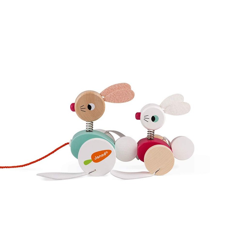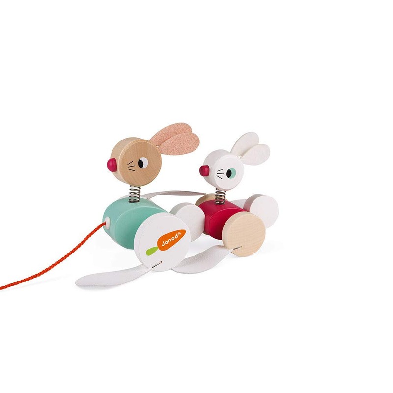 - Includes 2 wooden rabbits attached to a string that waddle when pulled