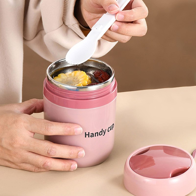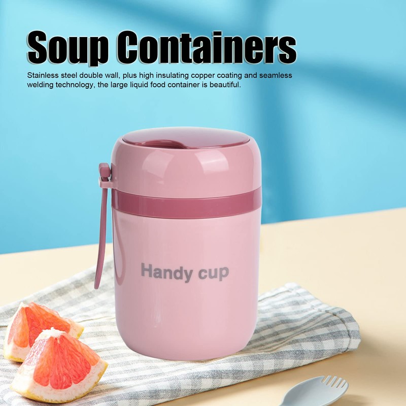 JAOCDOEN Recipientes de sopa aislados de 500 ml, doble antiescaldamiento, calentable, con cuchara plegable, para oficina, escuela, color rosa nórdico