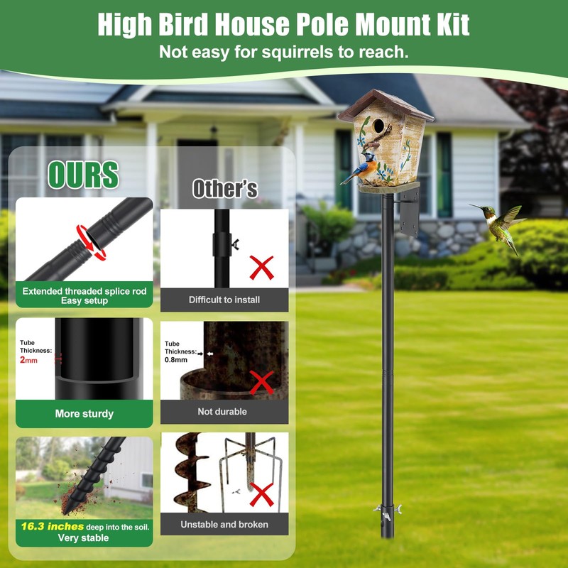 - Bird House PoMilitary-Grade Metal Construction - Built with 30% thicker galvanized steel than competitors, this pole withstands rust, UV rays, and heavy snow loads. Its powder-coated finish guarantees 5+ years of outdoor durability without corrosionle Mount Kit