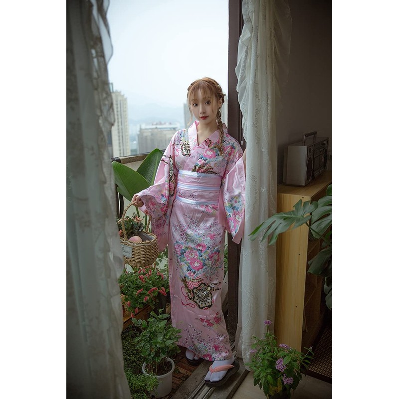 Japanese Anime Women's Long Kimono Robe Fancy Dress Hand Held Silk Folding Fans Tabi Socks OBI Belt Set Pink Plus Size