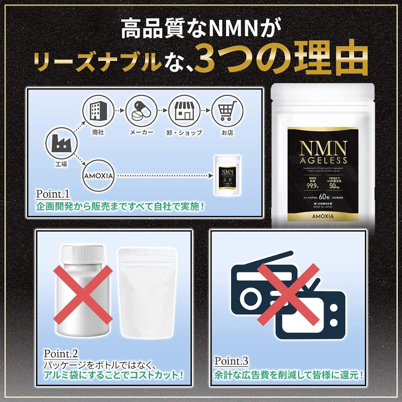 ☑高価Reason why expensive NMN is reasonable余計We realized a significant cost reduction by avoiding unnecessary trading companies, simplifying packaging, and not advertising expensive items such as TV and radio.