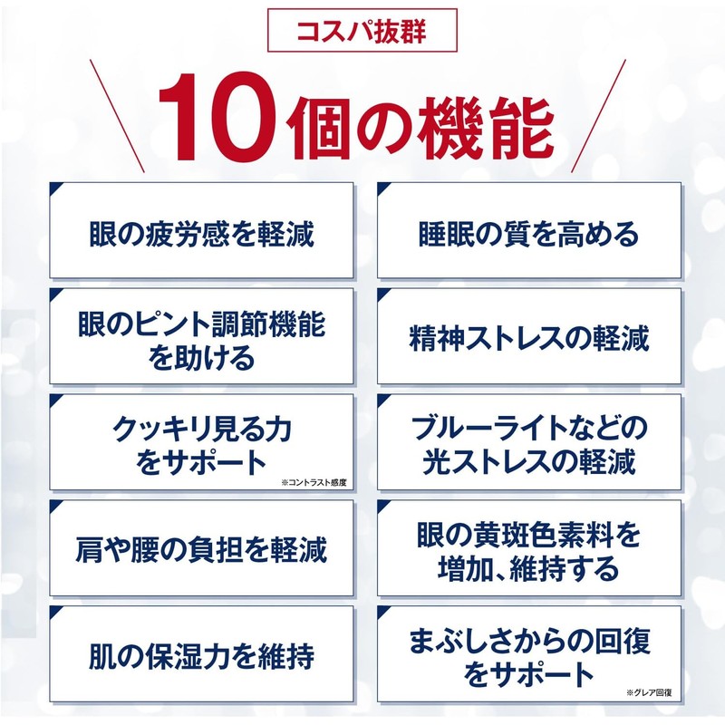 [Sleep quality/Blue light protection] Lutein and zeaxanthin improve sleep quality.It also helps reduce light stress such as blue lights and recover from glare.[Approach to eyes, shoulders, and waist] Astaxanthin helps reduce eye fatigue, helps adjust eye focus, and reduces the burden on shoulders and hips caused by eye use.It also helps protect skin moisture.