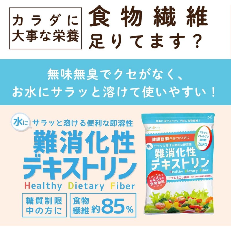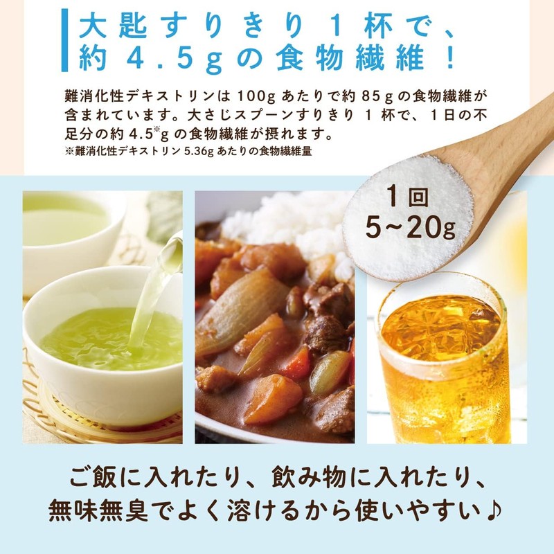 [Naturally derived dietary fiber! ] Naturally derived water-soluble dietary fiber (fiber) that has been specially processed to be difficult to clump and dissolve easily. Unlike supplements that are often forgotten, it is easy to use in powder form and can be used as a topping, such as sprinkled on salads. You can easily supplement the 5 to 10 grams of dietary fiber that modern people lack in their diets.