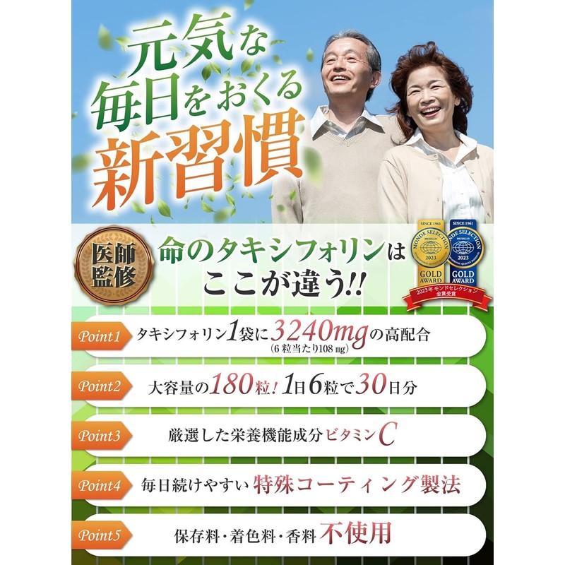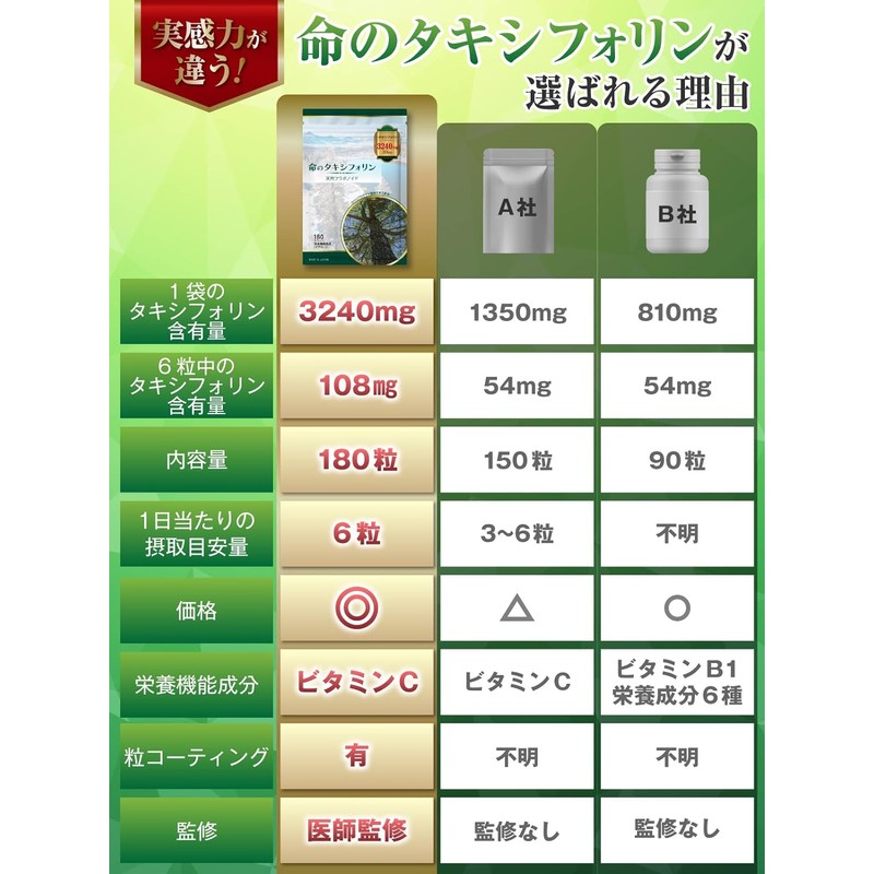 [Physician Supervision] Life's Tuxifoline is one of the top supplements in Japan with a tuxifoline content of 108 mg for 6 tablets and 324 mg for 180 tablets. Under the supervision of a doctor, we were thoroughly committed to standards and manufacturing.