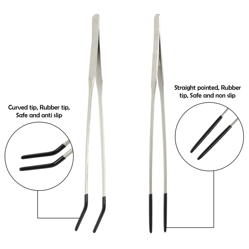 - EASY TO USE: These two tweezers come with different tips, including straight and curved tips, both designed with rubber head, which help grip things securely without slipping, making them ideal for feeding reptiles, carrying aquarium plants, and picking up worms wait.
