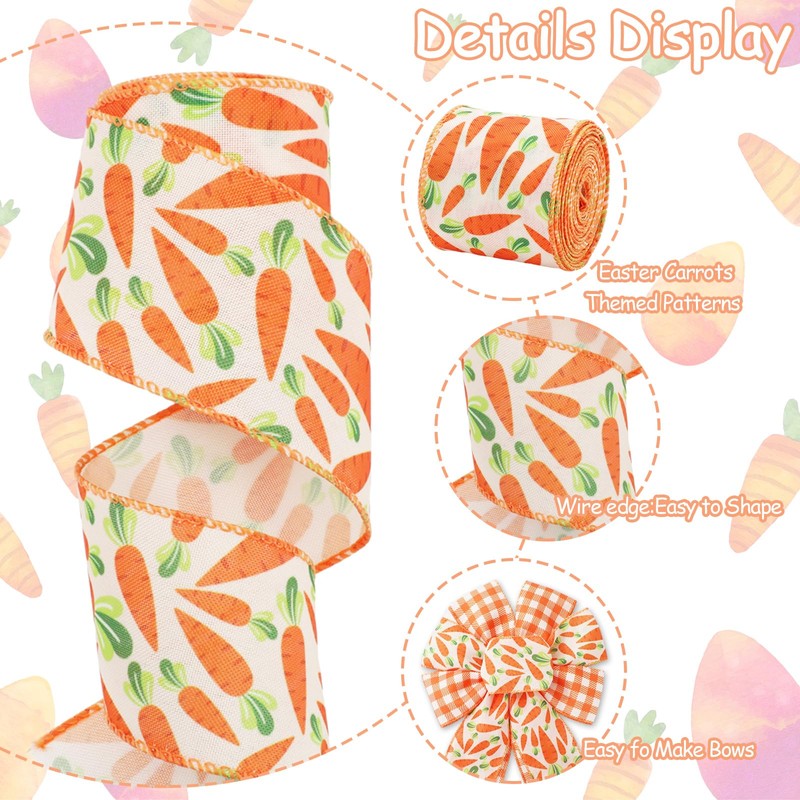 JarThenaAMCS Easter Wired Edge Ribbon Plaid Carrot Craft Ribbon Orange Cute Fabric Ribbon for Spring Wreath Bow DIY Wrapping Party Decor, 2 Rolls, 20 Yard
