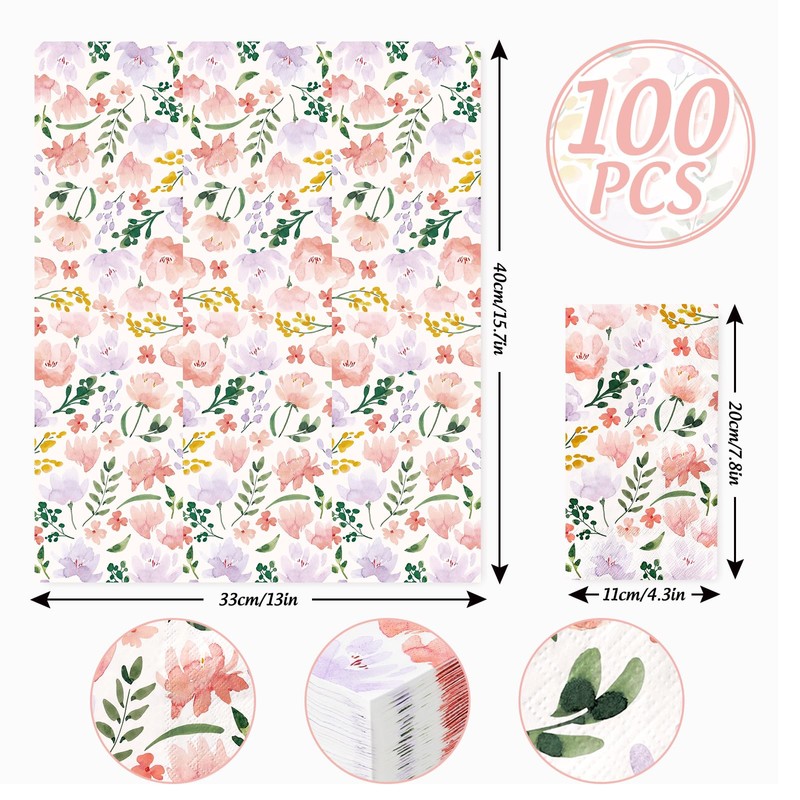 100 hojas de servilletas de invitados, estampadas con bonitas flores y hojas de acuarela, diseño delicado y atractivo que las hace adecuadas para la mayoría de las ocasiones.