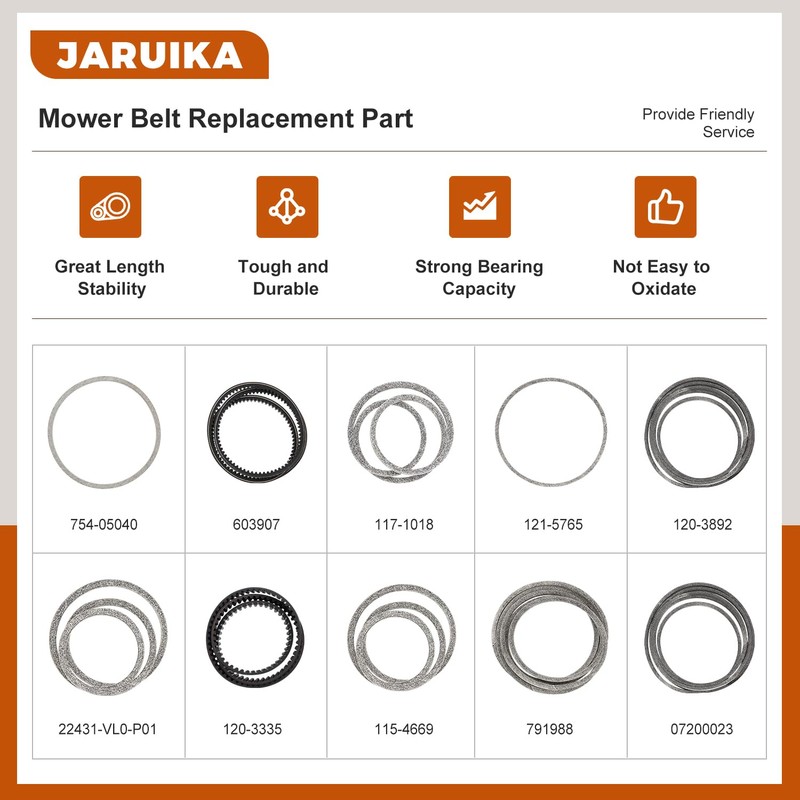 - 【Premium Material】Jaruika 120-3335 Riding lawn mower Belt, crafted from premium Neoprene and reinforced with Aramid cord (Kevlar cord), exhibit exceptional tensile strength and durability. It also has outstanding resistance to heat, oil, and wear, ensuring long-lasting performance. It operates with minimal friction, which translates to high transmission efficiency. Additionally, It is designed to prevent static electricity buildup, thereby promoting safety in use