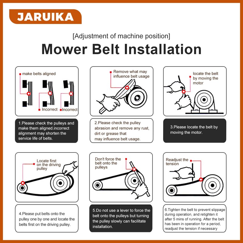 Jaruika 1120-3335 Cogged Lawn Mower Deck Drive Belt are made of premium Neoprene and Aramid cord ( kevlar cord ) , which has high tensile strength and toughness. It possesses excellent heat, oil, and wear resistance.