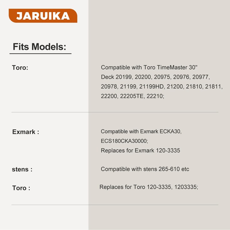 - 【Compatibility 】Jaruika 120-3335 Cogged Lawn Mower Deck Drive Belt is Compatible with Toro TimeMaster 30" Deck 20199, 20200, 20975, 20976, 20977, 20978, 21199, 21199HD, 21200, 21810, 21811, 22200, 22205TE, 22210; Compatible with Exmark ECKA30, ECS180CKA30000; Compatible with stens 265-610 etc