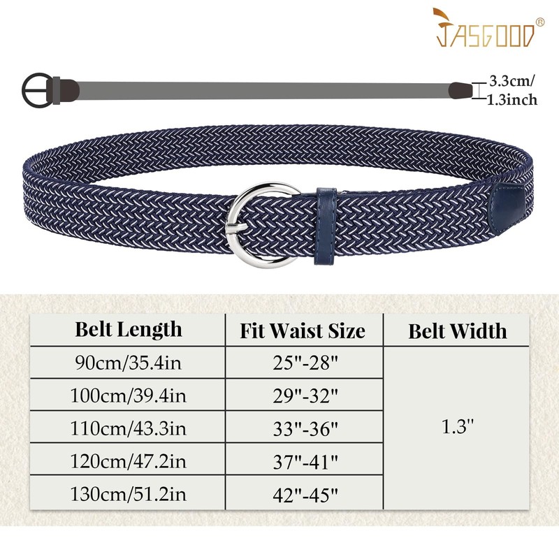 - Adjustable Casual Belt---The width of the elastic braided belt is 1.3". This women elastic belt has 5 sizes, fits waist size from 25" to 45". It is tight enough to hold your pants up, but stretchy enough to let you move flexibly with comfort.