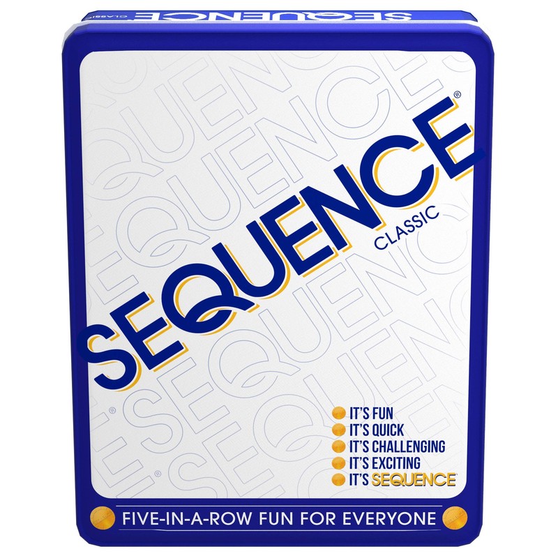 It's the fun and challenging game of SEQUENCE in a designed game tin! Play a card from your hand, place a chip on a corresponding space on the game board…when you have five in a row, it’s a SEQUENCE. Learn to block your opponents or remove their chips, and watch out for the Jacks - they're wild! With a little strategy and luck, you'll be a winner! Tin easily stores the folding game board and pieces, which include playing cards, 135 playing chips and complete instructions. For 2-12 players, ages 7 and up.