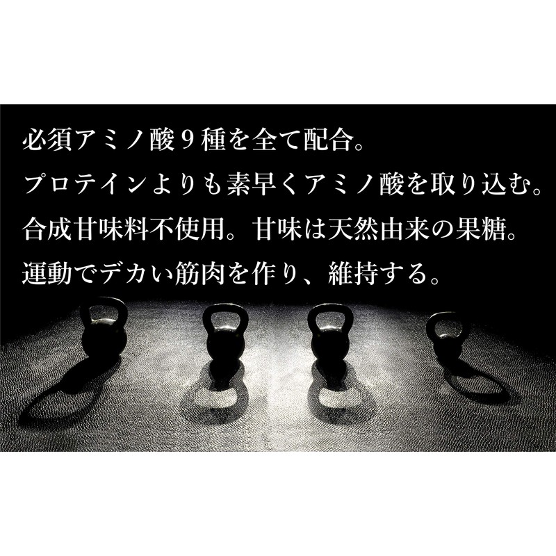 ・必須アミノ酸9種類すべてを配合しています。 ・お子様も安心、人工甘味料・保存料無添加。 ・1食10gあたりEAA 5000mg (BCAA 3071mg)。・付属のスプーン(袋内)1杯 約 10gを150cc~200cc程の水またはスポーツドリンクやジュースと混ぜてお召し上がりください。起床後に摂取することで、アミノ酸が不足している体へプロテインよりも素早くアミノ酸を取り込むことができます。