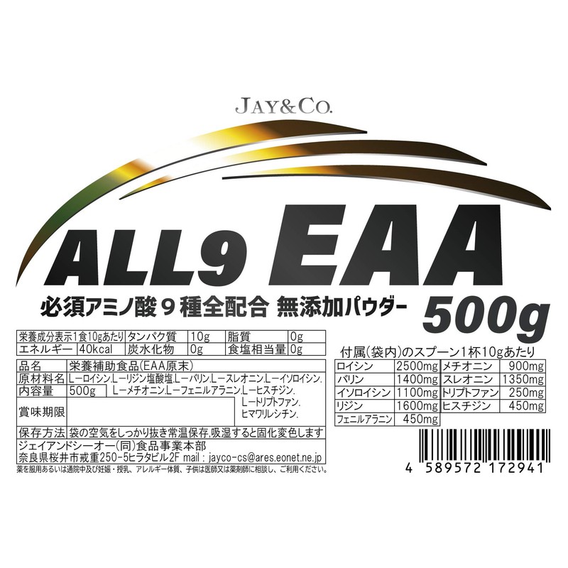 JAY&CO. アミノ酸スコア100 ALL9 EAA 必須アミノ酸 9種を全配合 (無添加 ノーフレーバー, 500g) 遺伝子組換え無し