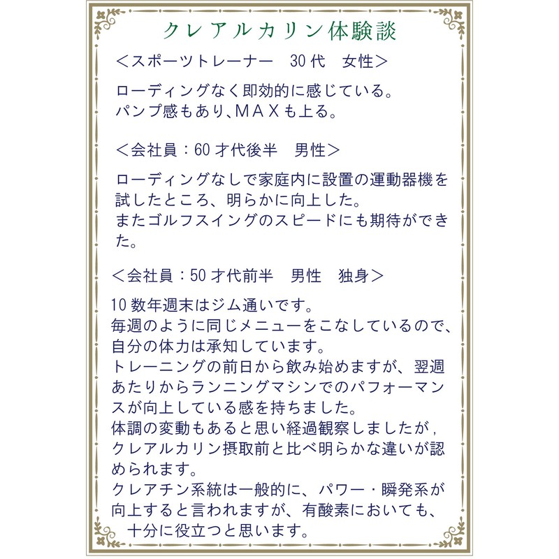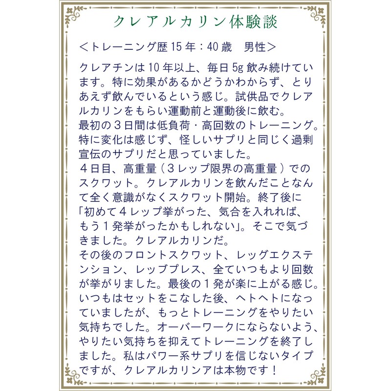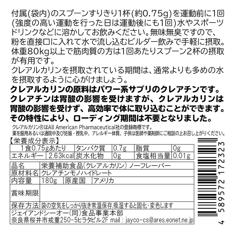 - 【素早く吸収されるパウダータイプ】パウダーは胃の中で速やかに溶けて吸収されますが、カプセルや錠剤は胃の中でゆっくり溶けるため吸収が遅く有用成分が働くまで時間がかかります。クレアルカリンは高吸収タイプのクレアチン。1回 0.75g×240回分。
