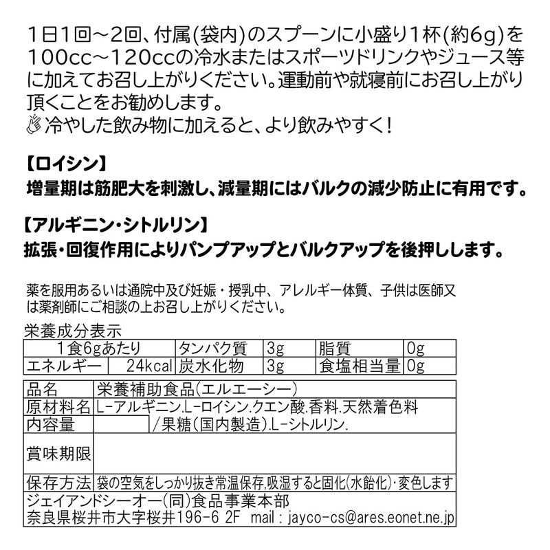 - 一食(6g)でロイシン1000mg&アルギニン1000mg&シトルリン1000mg。安心の、人工甘味料、保存料 無添加、合成着色料も使用していません。甘味は天然由来の果糖を使用。