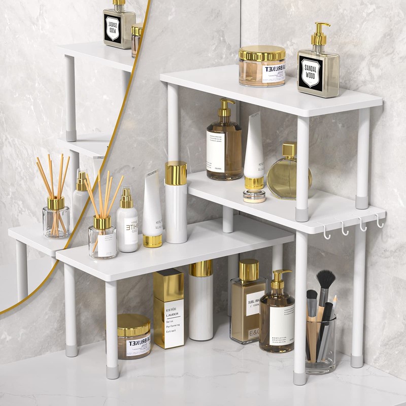 - GREAT SPACE SAVER: The bathroom countertop organizer is designed for cosmetics organization in the bathroom. Stainless steel framing ensures sturdy durability while allowing for a sleek aesthetic. Did we mention stack-able? The feet of one set simply slide onto the top of another set. When using one set on its own the feet add an adorable European design element to the beauty of this two-tier counter shelf.
