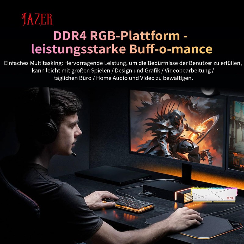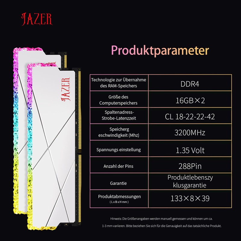 JAZER DDR4 RAM 32GB Kit (16GB x 2) 3200 MHz, 288-Pin UDIMM Desktop Memory, XMP 2.0 High Performance Memory CL18 1.35V RGB