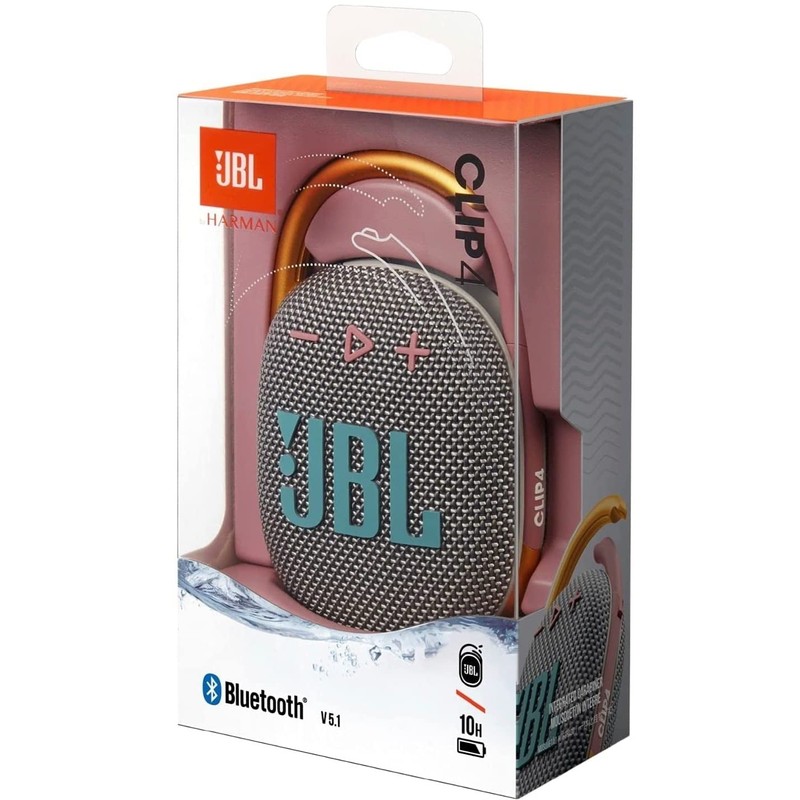 - JBL Clip 4’s ultra-portable design goes great with the latest styles, and its colorful fabrics and expressive details make it look as great as it sounds