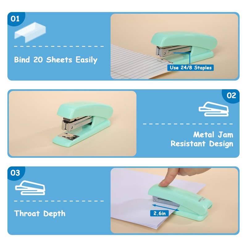 - Fashion Colors: This stylish and minimalist stapler has five beautiful colors for you to choose from, which can be used at school, home, and office.