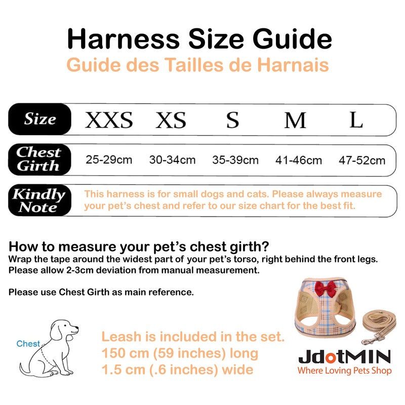 - 🐶 Dog and Puppy Harness and Leash Set: Dress up your puppy with a personalized dog harness specifically designed for small puppies and cats. The JDotMin Dog and Puppy Harness and Leash set is suitable for the following dog breeds including but not limited to: The Chihuahua;All Tea Cup varieties; Pomeranian; Toy Poodle; Shorkie; Maltipoo; Maltese; Yorkie; Shih Tzu; Doodle; Bichon Frise; Dachshund; Mini Dachshund; Mini Schnauzer; Mini Doberman; and the Pug. Please always measure your pet’s chest (fullest part) and refer to the JDotMin size guide.