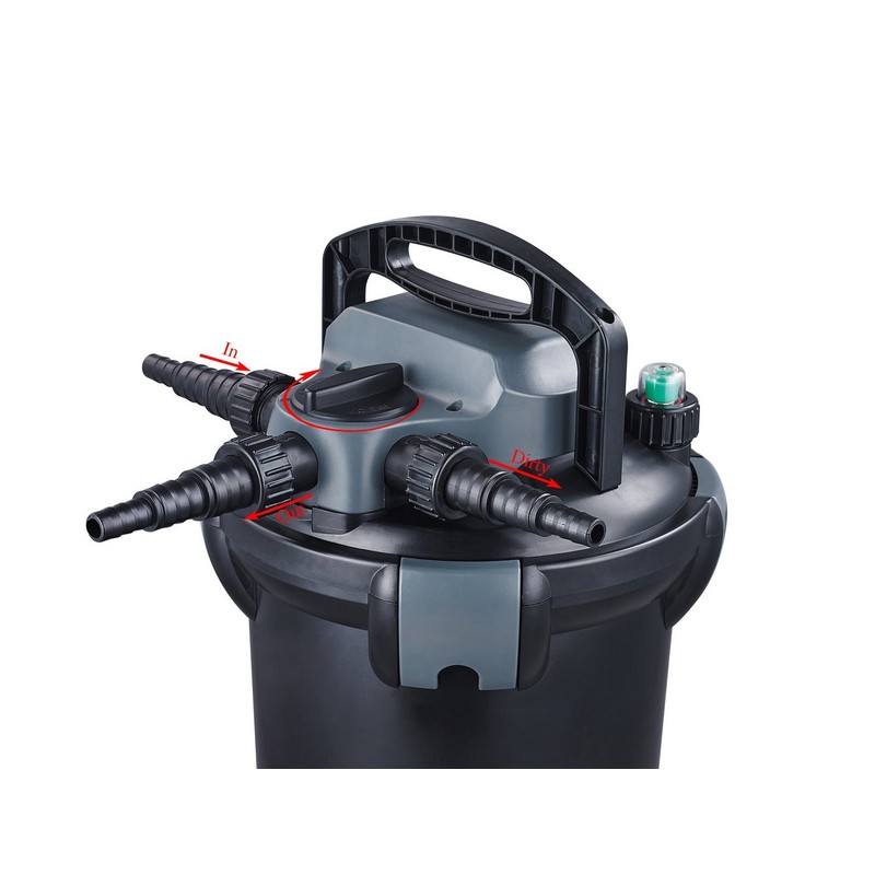 The jebao cbf-4000 pressurized filter has an integrated 13-watt uvc for improved clarity of pond water. There is an indicator light for uvc function monitoring. Easy clean technology for simple and convenient cleaning without having to open the filter. The cbf-4000 can be installed either above water level or recessed into the ground beside the pond up to the filter lid. Recommend pump size: 500-1500 gallon per hour.