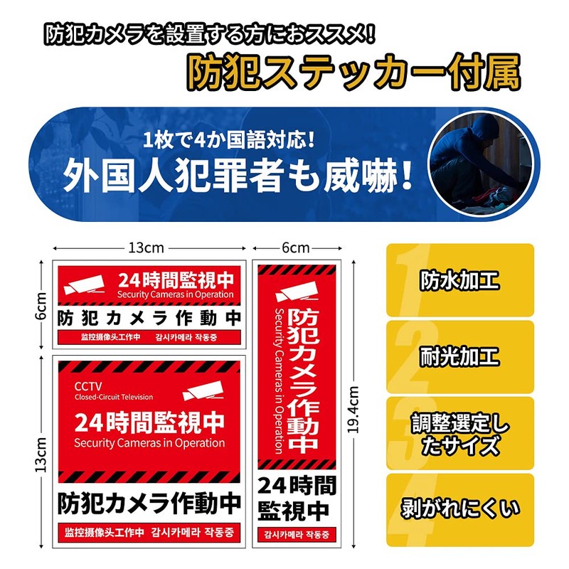 The included security sticker is compatible with 4 languages (Japanese, English, Chinese, Korean). It also demonstrates a suppression effect for global crimes.