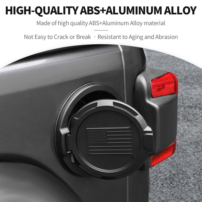 Durable Construction. JeCar gas tank cover is made of aluminum alloy and crafted with the highest standard ABS plastic, which makes it fully proof against rust. It's also very resistant to corrosion from gasoline and other harsh car-related chemicals so that it can stand up ruggedly to its intended use.