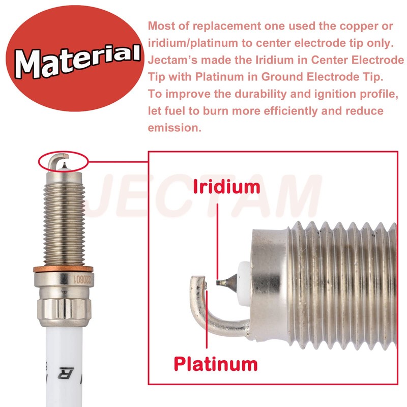• 【Platinum-Iridium Spark Plugs】Most of replacement one used the copper or iridium/platinum to center electrode tip only. Jectam’s made the Iridium in Center Electrode Tip with Platinum in Ground Electrode Tip. Every component either matches or improves on the OE design to ensure fast and easy installation with superior performance and reliability and provide long service life.