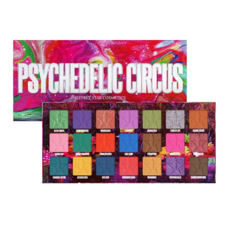 Introduciendo Psychedelic Circus de Jeffree Star: ¡Una explosión de colores y brillos que te llevará a un viaje cósmico de auténtica creatividad! Prepárate para deslumbrar con una colección única de 21 tonos impresionantes, cuidadosamente seleccionados para brindarte un look completo de galaxia de diva. Esta extraordinaria paleta de rectángulos de color te transportará a un estado alterado de pura emoción y posibilidades artísticas. Con 5 deslumbrantes brillos cambiantes psicodélicos, 14 sombras artísticas mate que despiertan la imaginación y 2 mates con brillo para un toque de elegancia audaz, estarás listo para crear cualquier look que desees. Ya sea que busques un look suave y celestial o un estilo vibrante y atrevido, esta paleta te ofrece todas las opciones para expresar tu singularidad. Los brillos te llevarán directamente a las estrellas con sus destellos cambiantes, mientras que las sombras mate aportan profundidad y drama a tus creaciones.