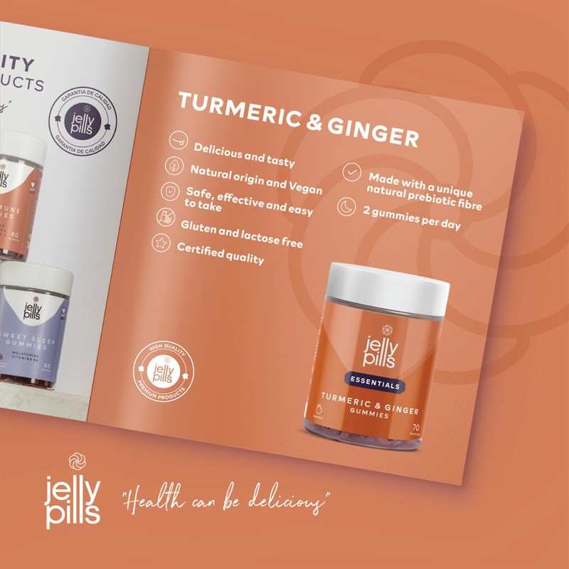 Jelly Pills® Turmeric Gummies with Ginger & Black Pepper - 70 Vegan Orange Flavoured Gummies - No Added Sugars - Curcumin Extract - Anti-Inflammation and Digestive Problems