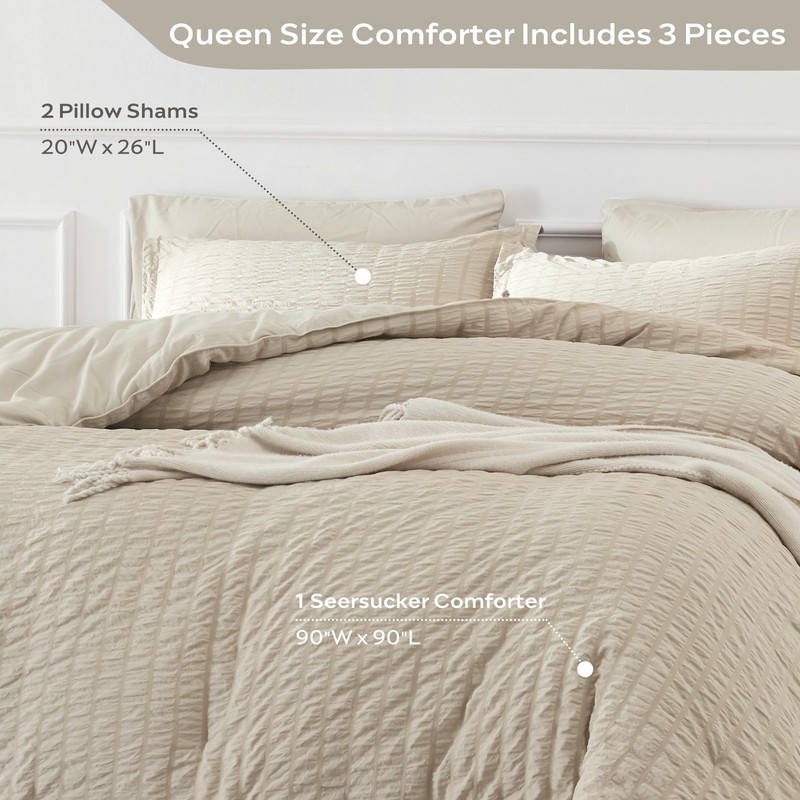 JELLYMONI Seersucker Comforter Set Queen Size, 3 Pieces Cream Grey Fluffy Bedding, All Season Lightweight Bedding Sets with Comforter, Pillow Shams