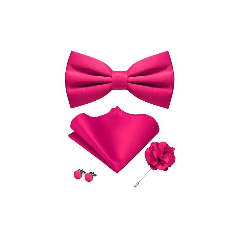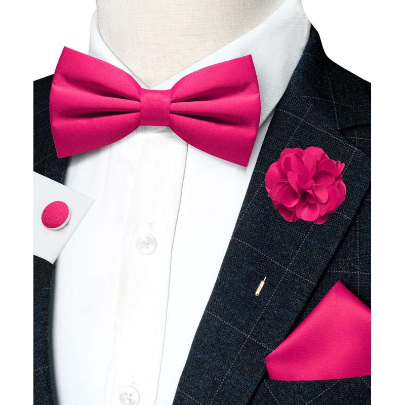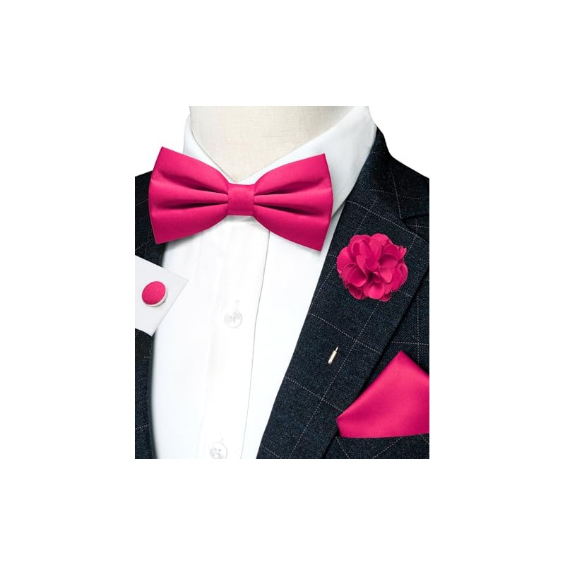 JEMYGINS Men's Matte Plain Bow Tie with Handkerchief Cufflinks and Corsage Set, Hot pink, M