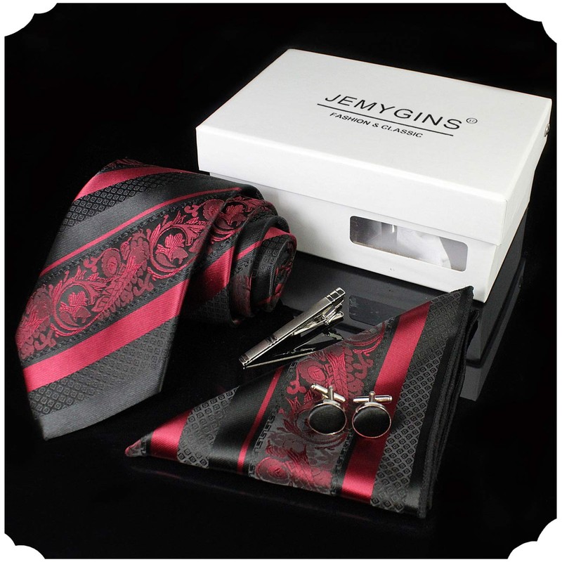 JEMYGINS Striped Luxury Necktie with Clip, Cufflinks and Pocket Square, Gift for Business, Job Hunting, Wedding, School Entrance Ceremonies, Graduations, After-Parties, Father's Day, Gift Box Included, winered, M