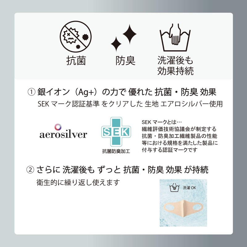 - Made with Aero Silver fabric that has passed SEK certification standards. (The SEK mark is a certification mark given to products that meet the standards for antibacterial and deodorizing processed textile products held by the Textile Evaluation Technology Council. )