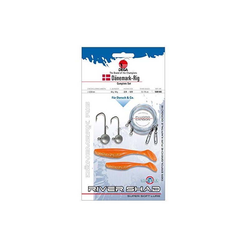 DEGA Denmark rig set orange. It has long been no longer a geneimnis that rubber fish is one of the catchers bait for cod etc. in the Baltic Sea. Our Dega team has put together the perfect complete system for rubber fishing from the cutter. The innovative Denmark complete set for jigging on cod & Co. Includes 2 fluo carb leaders, 2 different large river shadow rubber tables and 2 different weight jigheads equipped with spikes to be optimally prepared for all deep and flow conditions. Whether on the Baltic Sea as well as in flat regions of the North Sea, with this rig nothing stands in the way of success - not only in Denmark.