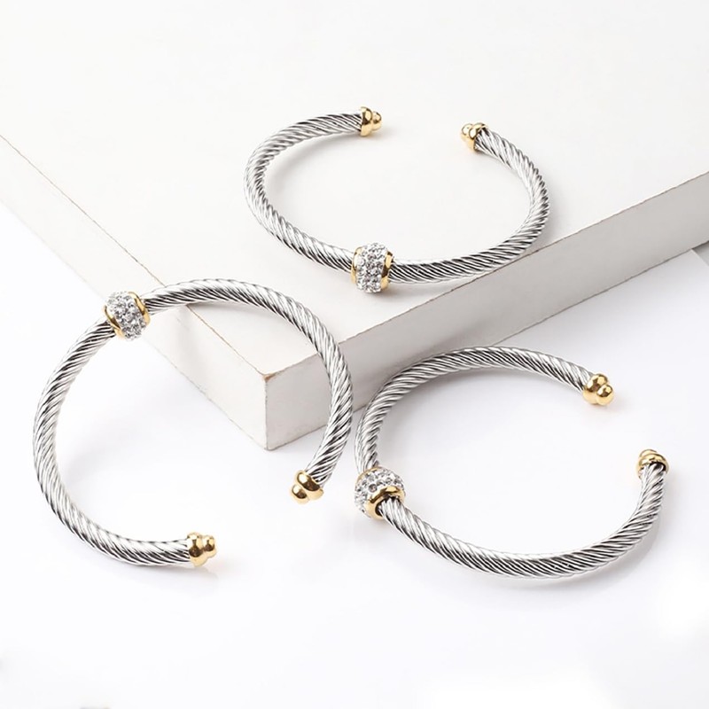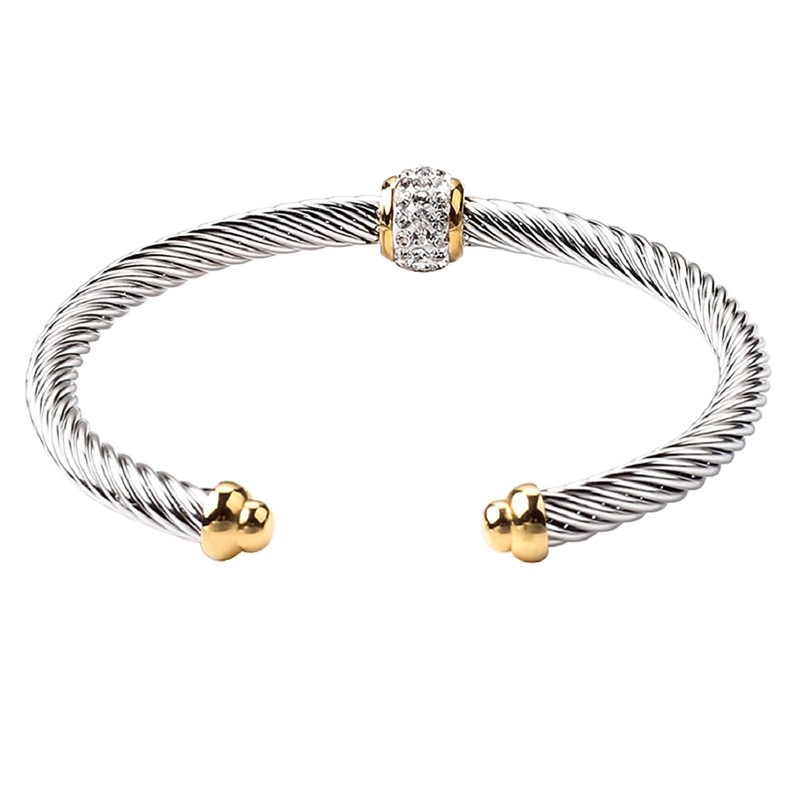 Jeolory 14K Gold Plated Rhinestone Ball Charm Adjustable Twist Stainless Steel Cable Wire Bracelets Friendship Open Bangle Wrist Cuff for Women Men