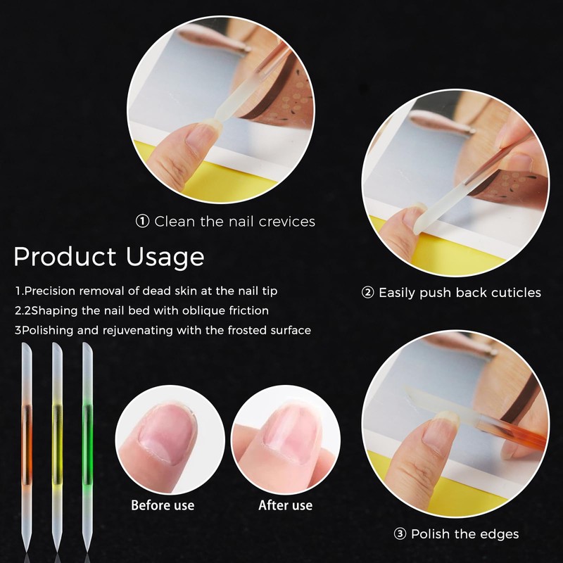 - Double-Ended Glass Nail Files: This set includes 3 nano-glass nail files in different colors, offering both style and practicality for personal or professional use.