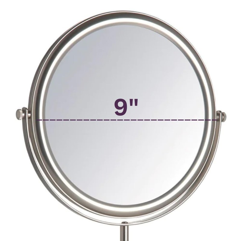 - SPECIFICATIONS - This simple, elegant personal mirror is perfect for any bathroom. The 9-inch diameter mirror is great for shaving, grooming, makeup application and more! The tabletop mirror stands 16.5 inches high and has a lightweight base for easy mobility. Protected under a 1-year warranty
