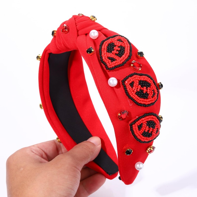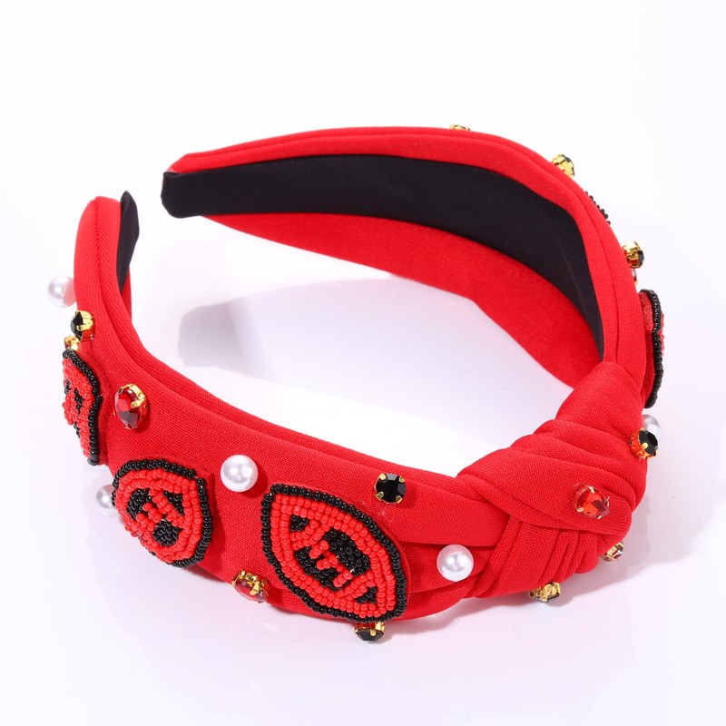 JERTOCLE - Diademas anudadas de fútbol para mujer, diadema deportiva con perlas de vidrio Bejeweled con nudo de la parte superior ancha, accesorios para el cabello para el día del juego (rojo y negro3)