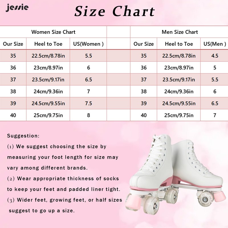 - 【Excellent Choice】Double row roller skates are safer and more stable than inline roller skates, especially suitable for beginners. If you are looking for a unique gift for your family, youth, or friends, this quad skates will be an excellent choice. Choosing jessie roller skates means choosing fashion, safety, comfort, and fun