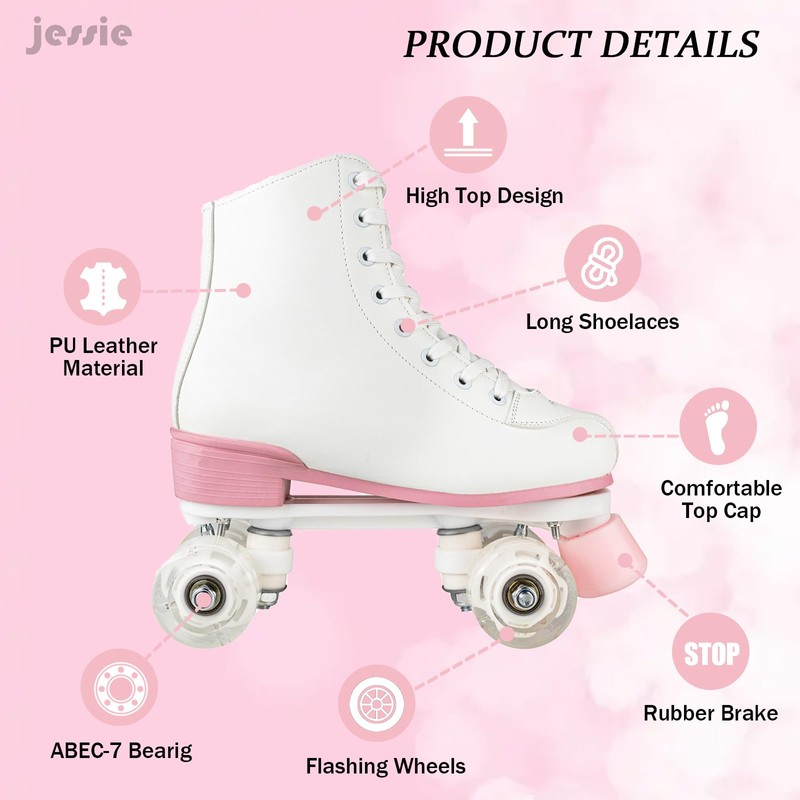 - 【Comfortable Fit】jessie White roller skates with light up wheels are made of synthetic leather, which is soft, comfortable. The padded lining ensures that your feet stay cozy, even during extended periods of skating. With the adjustable lace system, you can customize the fit to your liking, providing you with the support you need