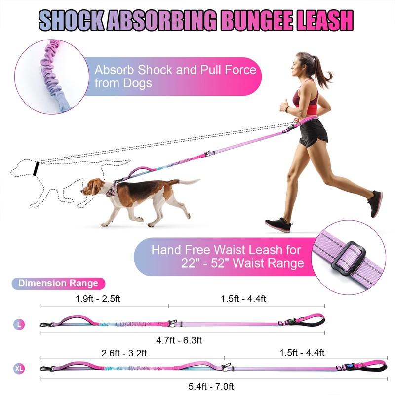 JETOG Heavy Duty Hands Free Dog Leash, 5-7 FT Reflective Adjustable Waist Dog Leash Belt with Padded Handles, Shock Absorbing Bungee and Car Seat Belt for Large Medium Dogs (Gradient Pink, XL)