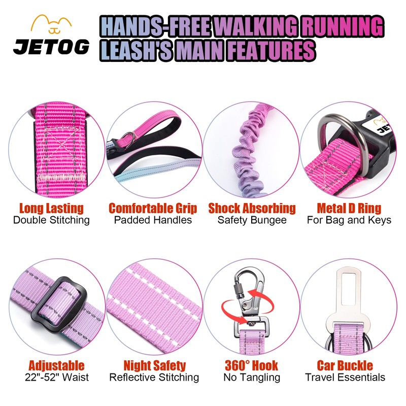 JETOG Heavy Duty Hands Free Dog Leash, 5-7 FT Reflective Adjustable Waist Dog Leash Belt with Padded Handles, Shock Absorbing Bungee and Car Seat Belt Leash