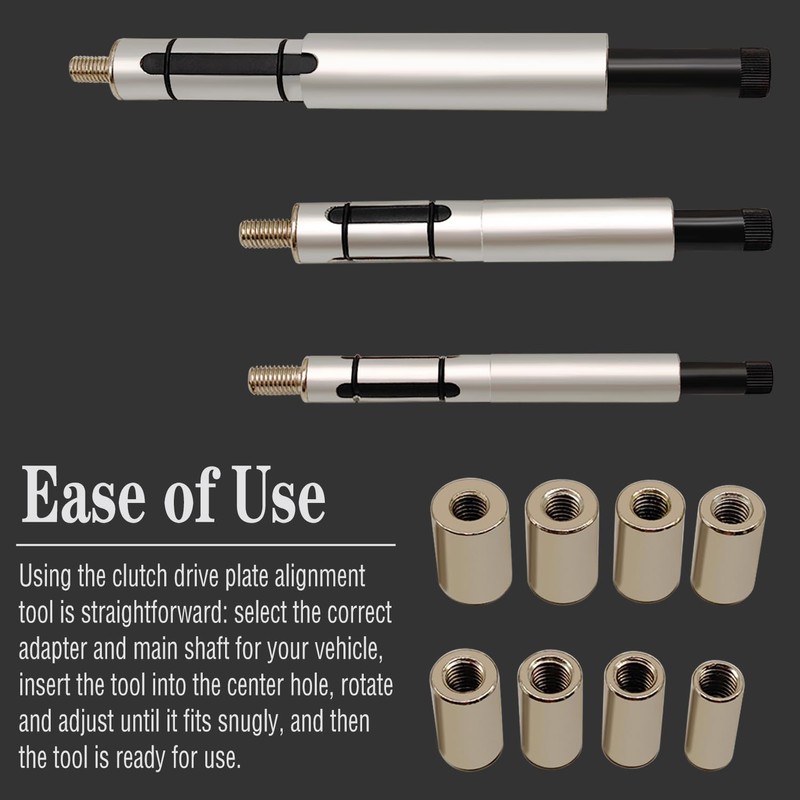 - Ease of Use: Using the clutch drive plate alignment tool is straightforward: select the correct adapter and main shaft for your vehicle, insert the tool into the center hole, rotate and adjust until it fits snugly, and then the tool is ready for use.
