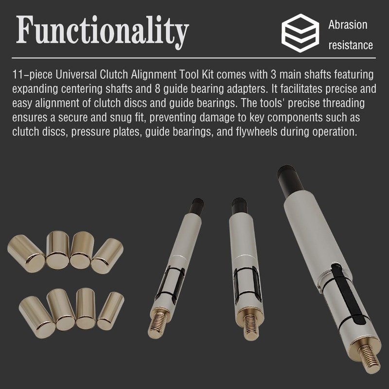 - Functionality: 11-piece Universal Clutch Alignment Tool Kit comes with 3 main shafts featuring expanding centering shafts and 8 guide bearing adapters. It facilitates precise and easy alignment of clutch discs and guide bearings. The tools' precise threading ensures a secure and snug fit, preventing damage to key components such as clutch discs, pressure plates, guide bearings, and flywheels during operation.