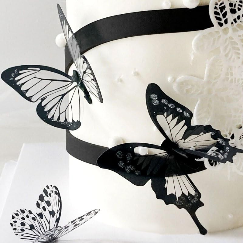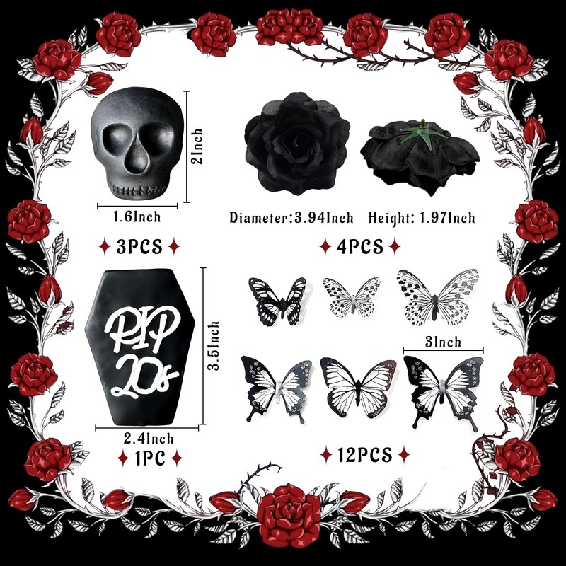 - Lo que recibirás: 1 adorno para pastel de los años 20, 12 adornos de mariposa negra, 4 rosas negras, 3 calaveras negras