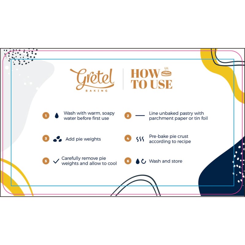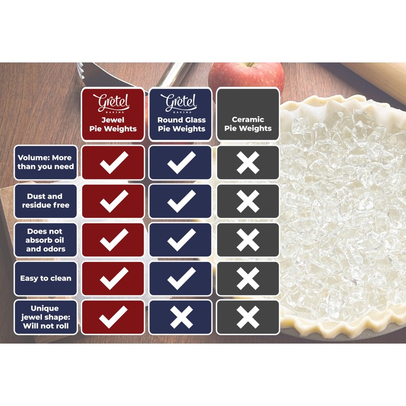 The team behind Gretel Baking has decades of experience with using and developing pie tools and is proud to offer these unique glass pie pan weights. Also known as cooking weights, blind baking weights, or blind baking beans, our borosilicate glass product is superior to metal pie weights and ceramic baking beans or pie stones in that they are dust-free, completely food safe, heat safe to very high temperatures, and easy to handle.