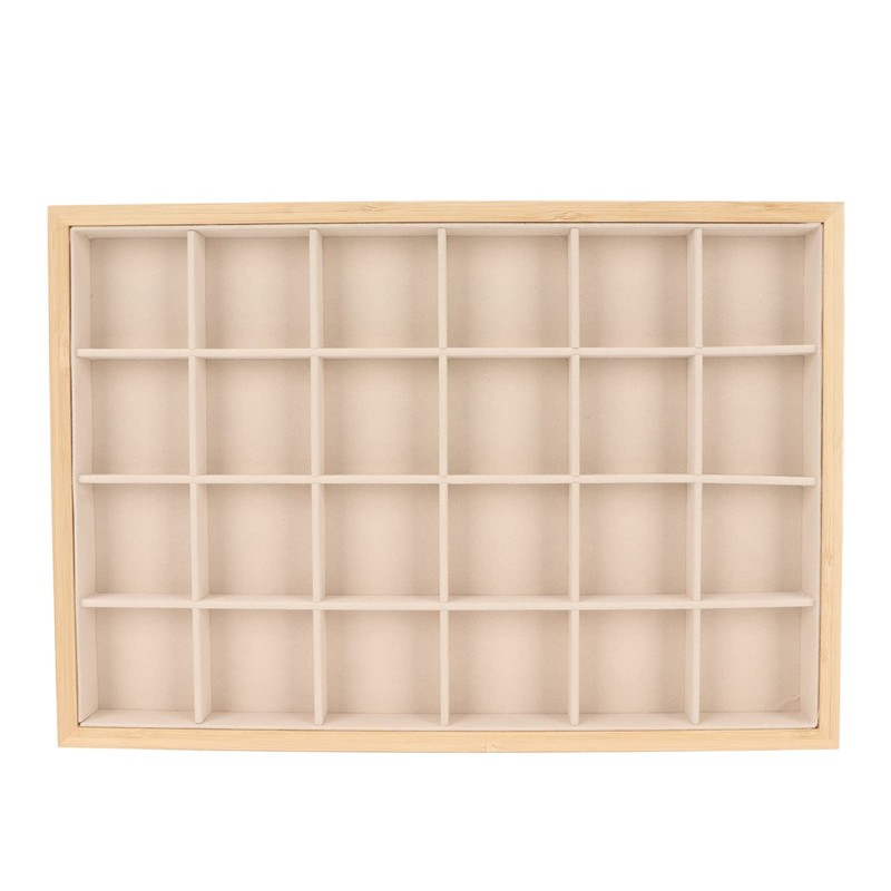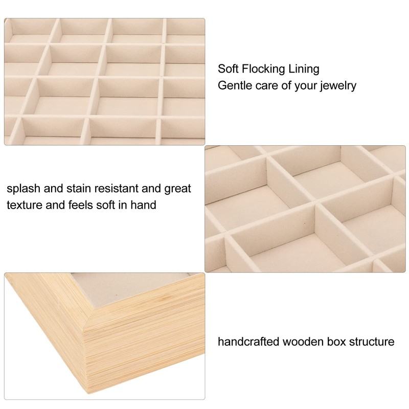 - Premium Material The 24 grid jewelry tray is made of sturdy solid wood boards and is wrapped in premium fluff for light weight and durability.
