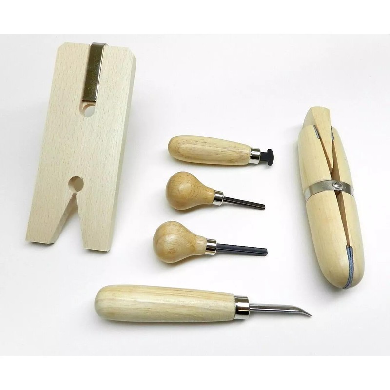 Crafted with precision, it includes a ring clamp, prong pusher, bezel roller, bezel pusher, curved burnisher, and a sturdy bench pin.